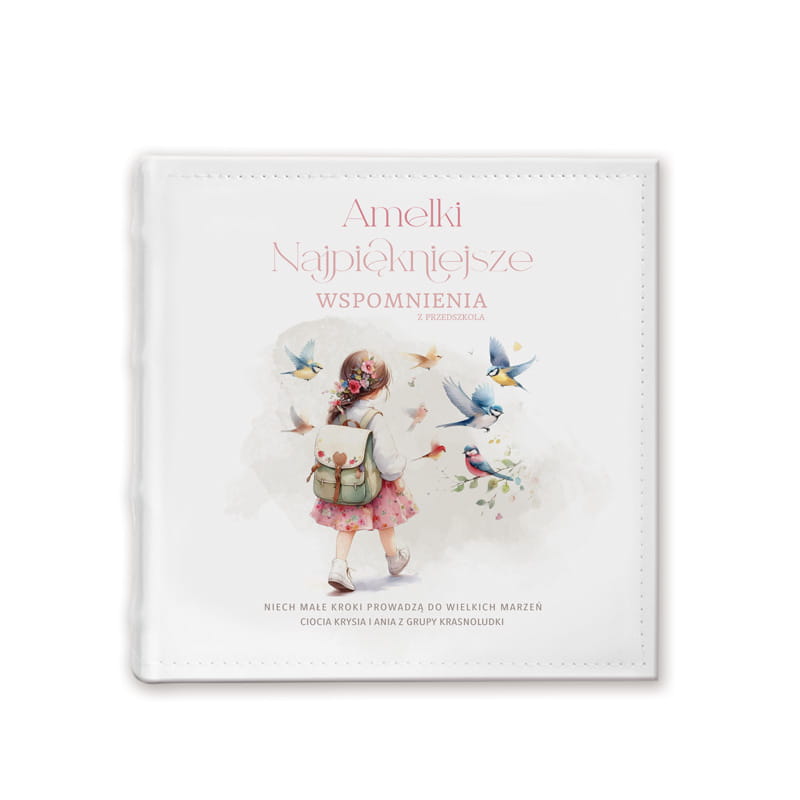 Album kieszeniowy z dziewczynką i ptakami to personalizowany prezent z możliwością umieszczenia 200 zdjęć w przejrzystych kieszonkach. Idealny na fotografie z przedszkola i pierwszych dziecięcych przygód. Album kieszeniowy dla przedszkolaka to praktyczny sposób na uporządkowanie zdjęć z pierwszych lat spędzonych wśród rówieśników. Okładka przedstawia dziewczynkę w różowej sukience z plecakiem na plecach, wokół której unoszą się kolorowe ptaki. Całość uzupełnia personalizacja – imię dziecka i dedykacja oraz cytat: „Niech małe kroki prowadzą do wielkich marzeń”. Dzięki temu album nabiera indywidualnego charakteru i jest w pełni dopasowany do małego właściciela.