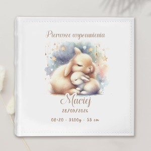 Album kieszeniowy z metryczką narodzin dziecka z grafiką króliczków i personalizacją to praktyczne miejsce na fotografie z pierwszych chwil życia malucha.