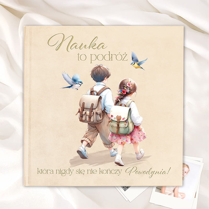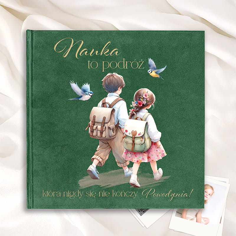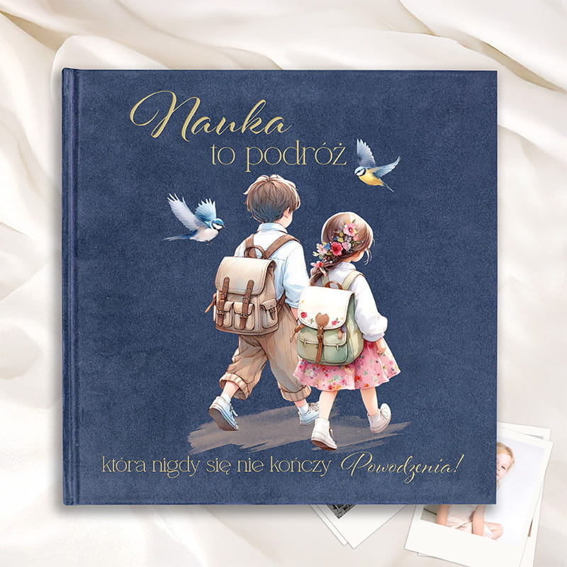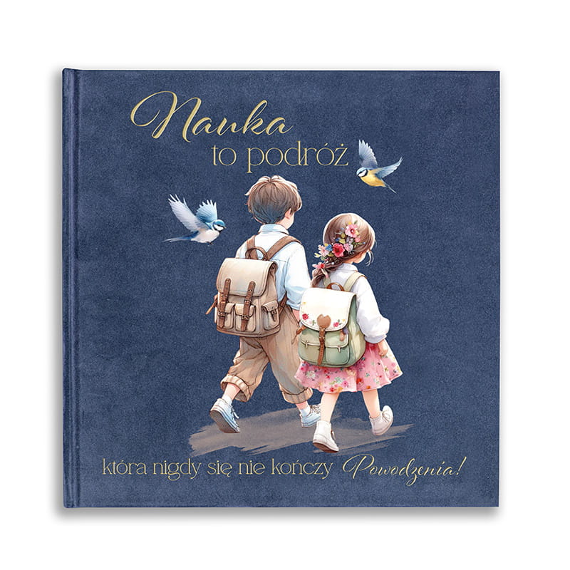 Album welurowy „Nauka to podróż” to prezent, który doskonale sprawdzi się na pasowanie na ucznia – jeden z pierwszych i najważniejszych momentów w szkolnym życiu dziecka. Okładka została wykonana z miękkiego weluru, nadając całości eleganckiego wyglądu. Na froncie znajduje się ilustracja przedstawiająca chłopca i dziewczynkę idących razem z plecakami szkolnymi, którym towarzyszą lecące ptaki. Motyw ten symbolizuje początek nowej drogi i odkrywanie kolejnych etapów edukacyjnej przygody. U góry umieszczono zdobny napis „Nauka to podróż”, a niżej hasło „która nigdy się nie kończy” oraz „Powodzenia!”, co podkreśla charakter i przesłanie albumu.