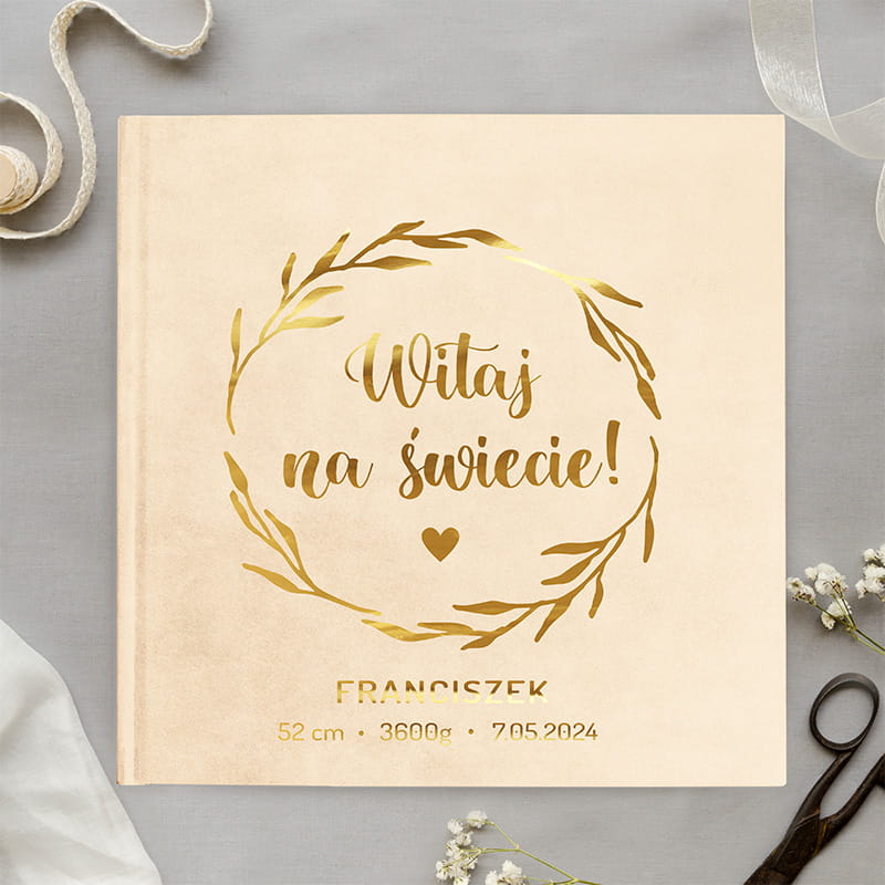 Album na zdjęcia oprawiony w miękki welur w jasnej kolorystyce to elegancki i praktyczny sposób na przechowywanie fotografii z pierwszych dni życia dziecka. Okładkę zdobi złoty napis „Witaj na świecie!” wraz z personalizacją – imieniem maluszka, datą narodzin, wzrostem i wagą. Zdobienie wykonane jest w odcieniu złota, które efektownie odbija światło i nadaje całości estetycznego wyglądu. Wewnątrz albumu znajdują się szyte karty, co zapewnia większą trwałość konstrukcji. Każda karta oddzielona jest pergaminową przekładką, która chroni zdjęcia przed sklejaniem się i uszkodzeniami. Dzięki gładkiej powierzchni stron można wklejać fotografie w różnych formatach i dodawać własne opisy.
