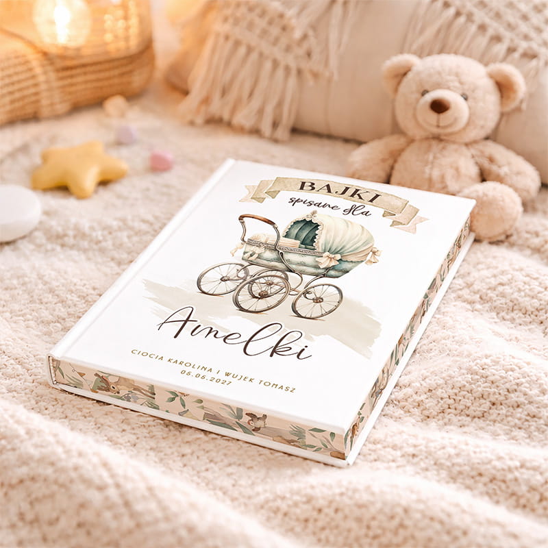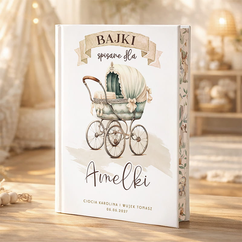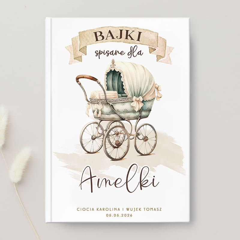 Personalizowana książka „Bajki spisane dla Amelki” z uroczą grafiką wózka vintage – wyjątkowy prezent na narodziny dziewczynki.