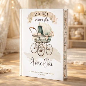 Personalizowana książka z bajkami z okładką z ilustracją wózka dziecięcego w stylu retro. Personalizacja imienia dziecka, dedykacji oraz daty narodzin dziewczynki. Wyjątkowy prezent na narodziny dziecka od członków rodziny.