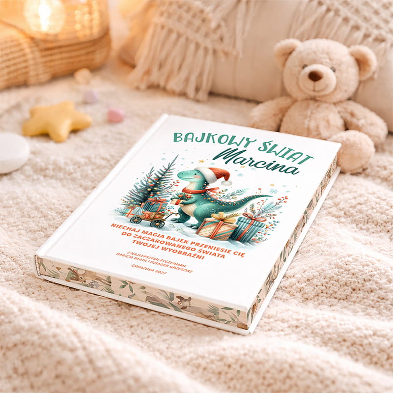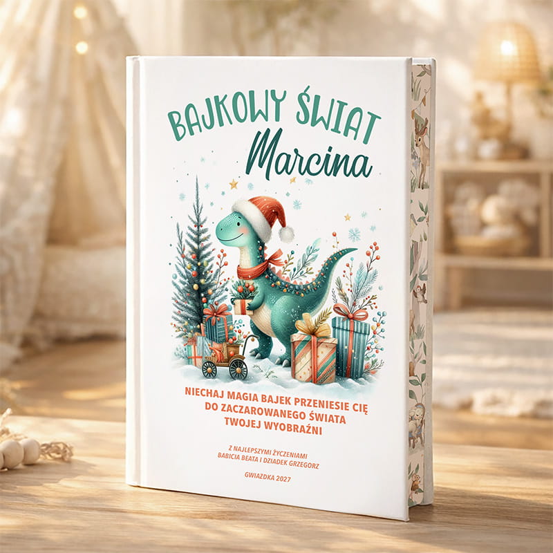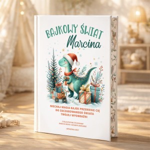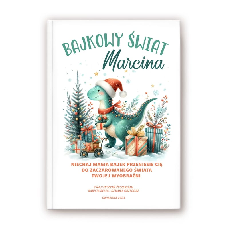 Personalizowana książka „Bajkowy świat” to świąteczna propozycja, w której imię dziecka pojawia się w tytule, a na okładce znajduje się dedykacja od osoby wręczającej prezent. Okładka utrzymana jest w zimowym klimacie – przedstawia sympatycznego dinozaura w czapce Mikołaja, otoczonego choinką, prezentami i świątecznymi ozdobami. Widnieje na niej również hasło: „Niechaj magia bajek przeniesie Cię do zaczarowanego świata Twojej wyobraźni”, co podkreśla wyjątkowy charakter książki i wprowadza w bajkową atmosferę Bożego Narodzenia.