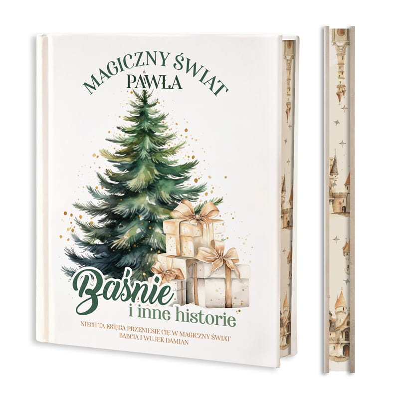 Personalizowana książka „Baśnie i inne historie” to wyjątkowy prezent, który idealnie wpisuje się w klimat Świąt Bożego Narodzenia i Mikołajek. Już sama okładka przyciąga uwagę – na górze widnieje tytuł „Magiczny świat [Imię]”, poniżej napis „Baśnie i inne historie”, a całość uzupełnia napis „Niech ta księga przeniesie Cię w magiczny świat” wraz z personalizowaną dedykacją. Urokliwa ilustracja przedstawiająca choinkę ozdobioną złotymi akcentami oraz stos prezentów wprowadza w bajkowy, świąteczny nastrój.