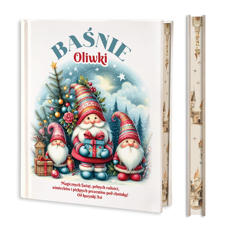 Personalizowana książka „Baśnie” to wyjątkowy prezent świąteczny dla dziecka, który łączy magię opowieści z osobistym akcentem. Na okładce znajduje się tytuł „Baśnie”, imię dziecka oraz dedykacja od osoby wręczającej, co czyni podarunek jeszcze bardziej unikatowym. Ilustracja przedstawia urocze krasnale w barwnych, świątecznych czapkach, stojące przy choince na tle zimowego pejzażu. Bogactwo kolorów i detali sprawia, że książka już od pierwszego spojrzenia wprowadza w magiczny nastrój Bożego Narodzenia.