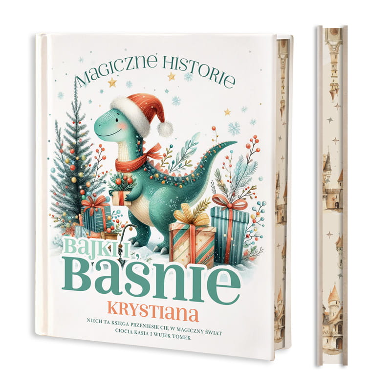 Personalizowana książka „Bajki i baśnie” z motywem świątecznym to wyjątkowy prezent pod choinkę, który wprowadza najmłodszych w magiczny klimat Bożego Narodzenia. Na okładce w centralnym miejscu znajduje się imię dziecka, a tuż pod nim dedykacja od osoby wręczającej, co sprawia, że książka nabiera osobistego i niepowtarzalnego charakteru. Całość zdobi urocza ilustracja przedstawiająca zielonego dinozaura w czapce Mikołaja, otoczonego choinką, kolorowymi prezentami i świątecznymi dekoracjami. Pastelowe barwy, zimowe akcenty i przyjazny bohater sprawiają, że okładka od razu przyciąga uwagę. Na niej znalazł się również napis: „Niech ta księga przeniesie Cię w magiczny świat”, który doskonale podkreśla charakter podarunku.