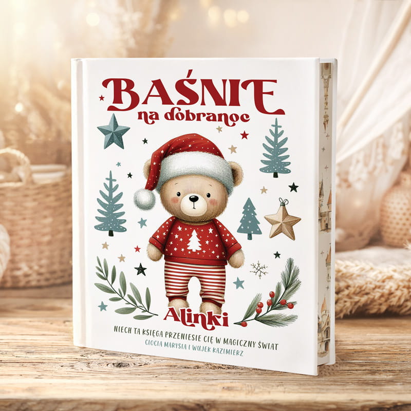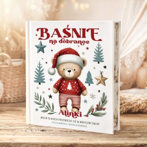 Personalizowana książka „Baśnie na dobranoc” z imieniem dziecka na okładce to świąteczna propozycja z uroczym misiem w czapce Mikołaja, idealna jako prezent pod choinkę lub na Mikołajki.