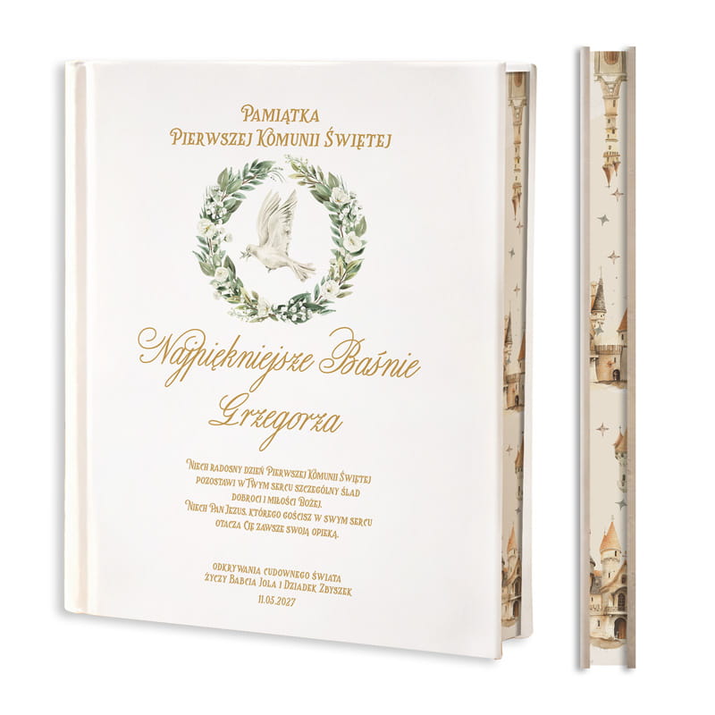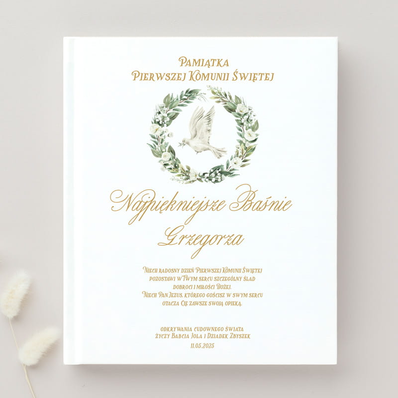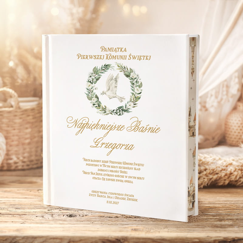 Pierwsza Komunia Święta to wyjątkowy moment w życiu każdego dziecka. Właśnie wtedy warto podarować dar, który na długo zostanie w pamięci. Starannie wydana książka z baśniami, stworzona z myślą o tej szczególnej okazji, idealnie nadaje się na prezent od dziadków na Komunię. Elegancka, biała okładka z delikatnymi akcentami i rysowanym wiankiem, w którego centrum wiruje gołąb – symbol wiary i czystości – przyciąga wzrok. Imię dziecka i napis "Pamiątka Pierwszej Komunii Świętej" dodają osobistego charakteru, co sprawia, że książka staje się niezapomnianym upominkiem.