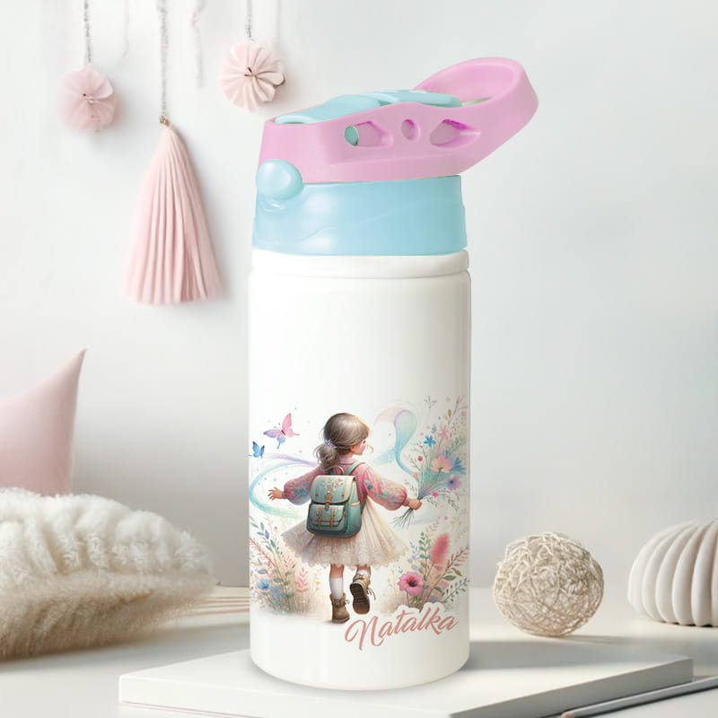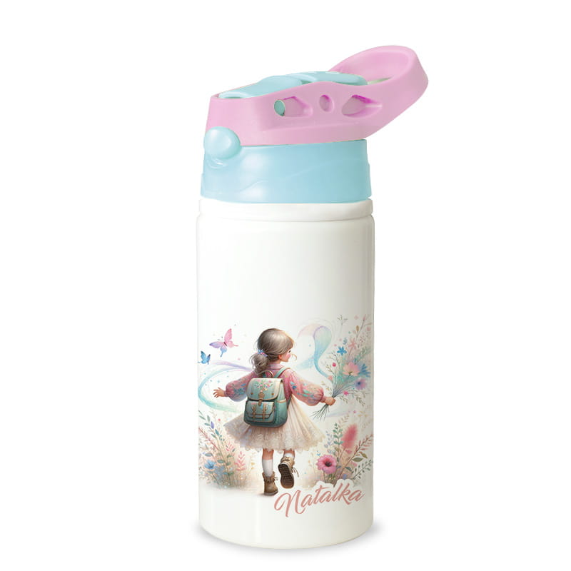 Na przedzie znajduje się przepiękna ilustracja dziewczynki z plecakiem, otoczonej kwiatami, motylami i pastelowymi kolorami, która niesie bukiet i z uśmiechem rusza ku nowej przygodzie. Całość dopełnia personalizowany napis z imieniem dziecka co sprawia, że bidon staje się jedyny w swoim rodzaju.