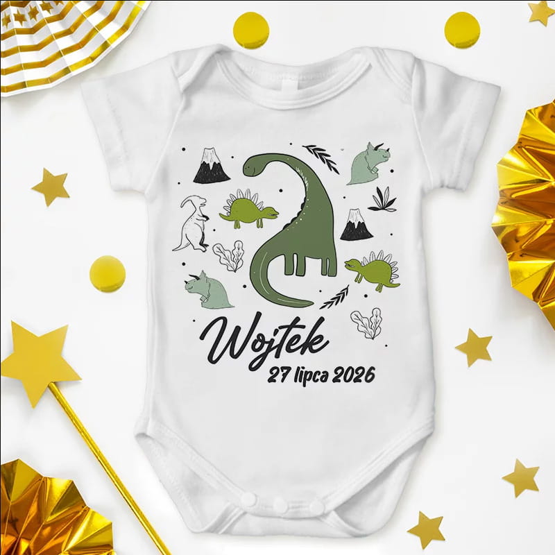 Personalizowane body niemowlęce z dinozaurami to uroczy prezent z imieniem i datą urodzenia. Kolorowy nadruk, miękka bawełna i funkcjonalność sprawiają, że to idealny wybór na narodziny, roczek lub baby shower. Dodaj wyjątkowości dziecięcej wyprawce dzięki temu oryginalnemu body.