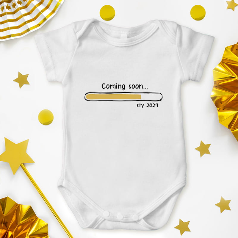 Body dziecięce z napisem „Coming soon...” to uroczy i kreatywny sposób na ogłoszenie radosnej nowiny o powiększeniu rodziny. Wzór przedstawiający pasek postępu i planowany miesiąc narodzin subtelnie zdradza, że maleństwo jest już w drodze. Taki gadżet to nie tylko zabawna forma powiadomienia o ciąży, lecz także wzruszająca pamiątka dla rodziców i bliskich. Dodatkowo personalizacja datą nadaje wydarzeniu osobistego charakeru