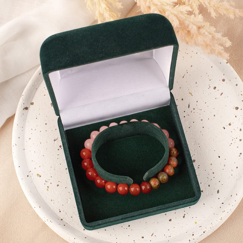 Podaruj wyjątkowy upominek, który łączy subtelność i elegancję – bransoletkę z kamieni naturalnych w aksamitnej szkatułce z personalizowanym monogramem. To nie tylko stylowa biżuteria, ale również osobisty gest, który wyrazi więcej niż słowa. Bransoletka z kamieni naturalnych w pięknych kolorach. Kolorystyka została dobrana tak, aby pasowała do wielu stylizacji – od codziennych po wieczorowe.