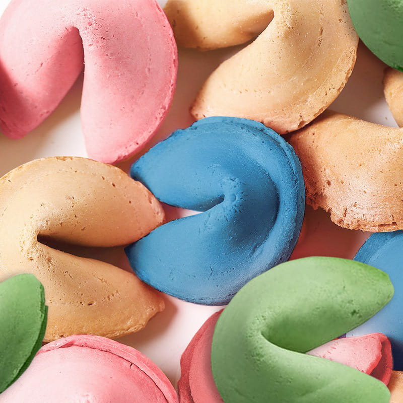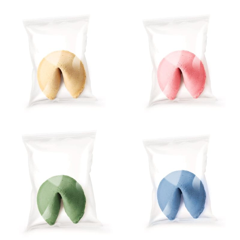 Zestaw zawiera 200 ciasteczek z wróżbą w czterech kolorach – biszkoptowym, różowym, zielonym i niebieskim, każde w oddzielnym opakowaniu.