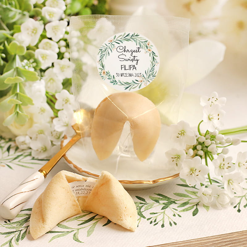 Ciasteczka z wróżbą to doskonały wybór – nie tylko smakowity, ale też intrygujący. Każde ciasteczko zostało starannie zapakowane w przezroczysty woreczek, który zabezpiecza je przed utratą świeżości. Dołączona do opakowania etykieta z motywem zielonego wieńca nadaje mu eleganckiego charakteru. W jej centrum umieszczony jest napis „Chrzest Święty”, imię dziecka oraz data wydarzenia – wszystko utrzymane w spokojnym, harmonijnym stylu.