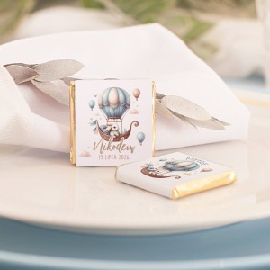 Delikatna grafika w odcieniach błękitu, beżu i różu nadaje czekoladkom subtelny wygląd, pasujący do dziecięcej aranżacji stołu. Upominek można rozłożyć przy nakryciach gości, zapakować w ozdobne woreczki lub dołączyć do innych drobiazgów wręczanych podczas uroczystości. Dzięki personalizacji każda czekoladka nabiera indywidualnego charakteru i staje się spójną częścią całej oprawy przyjęcia. W zestawie znajduje się 10 sztuk mlecznych czekoladek o wadze 5 g każda. To porcja idealna jako drobny poczęstunek, który łączy w sobie przyjemny smak i elegancki wygląd. Taki upominek sprawdzi się podczas urodzin, roczku czy innych rodzinnych spotkań, wprowadzając dodatkowy, estetyczny akcent do przygotowanej aranżacji.