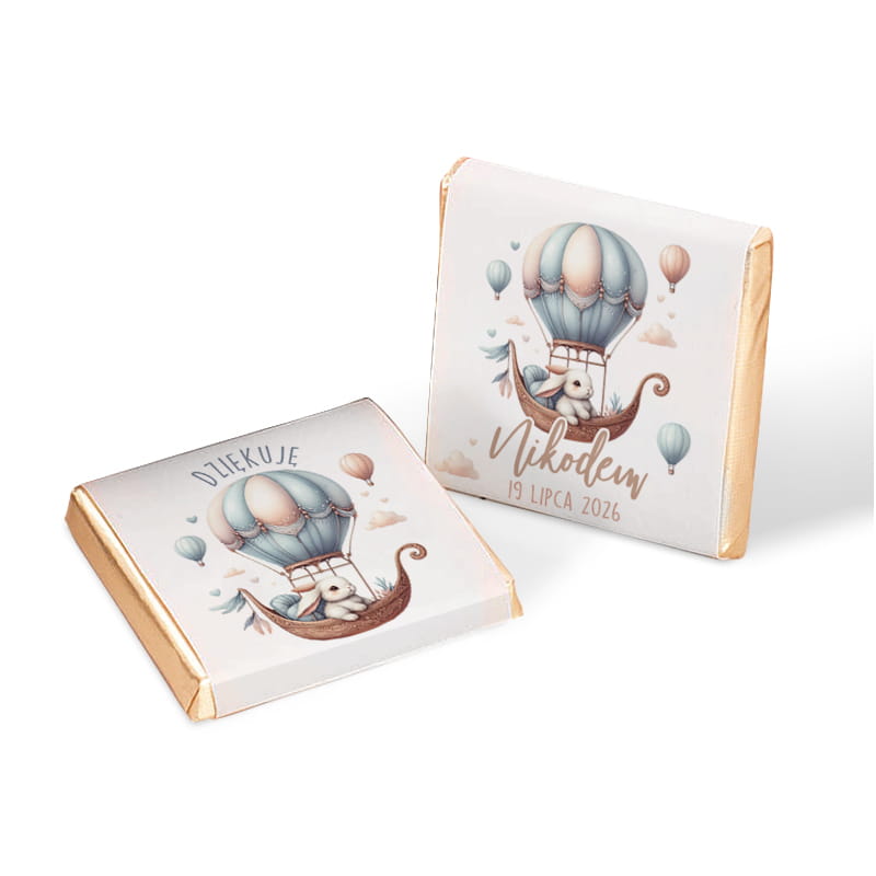 Personalizowane czekoladki to prosty i estetyczny sposób na przygotowanie podziękowań dla gości zaproszonych na dziecięce przyjęcie. Każda mleczna czekoladka została owinięta w złote sreberko, a następnie udekorowana etykietą w jasnej, pastelowej kolorystyce. Na froncie umieszczone jest imię dziecka, data wydarzenia oraz ilustracja króliczka siedzącego w koszu balonu. Druga strona zawiera napis „Dziękuję”, co sprawia, że słodkość pełni jednocześnie funkcję symbolicznego gestu wdzięczności.