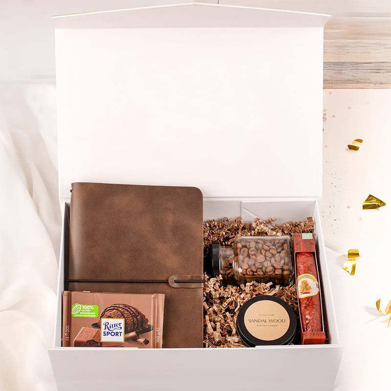 W stylowym pudełku z napisem „Dla najlepszego Taty na świecie” znajduje się elegancki zestaw, łączący estetykę z praktycznymi dodatkami. Znajdziesz tu elegancki notatnik, aromatyczną świecę zapachową, a także starannie zapakowaną buteleczkę z ziarnami kawy. Całość uzupełniają pyszna czekolada oraz czekoladowe cyagro – akcent, który z pewnością ucieszy każdego smakosza.
