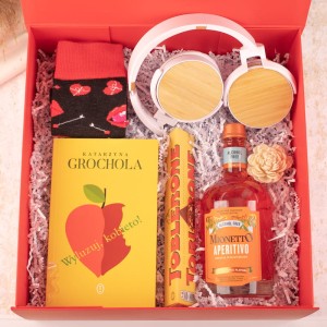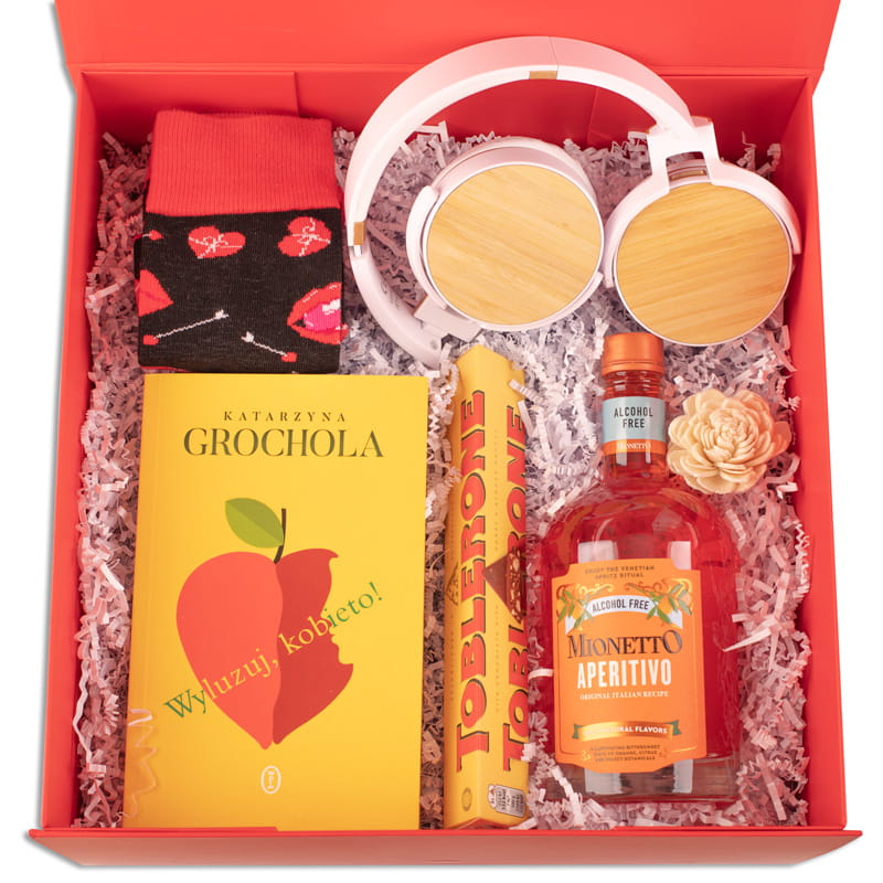 Elegancki zestaw prezent na rocznicę ślubu lub Walentynki w personalizowanym czerwonym pudełku z imieniem to idealny sposób, aby podkreślić wyjątkowość chwili. W środku znajdują się starannie dobrane upominki - książka Katarzyny Grocholi „Wyluzuj, kobieto!”, słodka czekolada Toblerone, bezalkoholowy napój Mionetto Aperitivo, białe słuchawki oraz modne skarpetki.