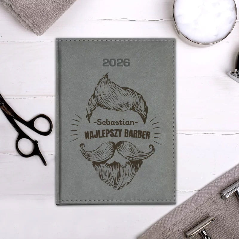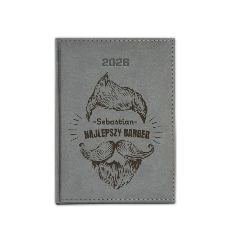 Na eleganckiej okładce dostępnej w 5 różnych kolorach widnieje personalizowany napis: (imię właściciela) – Najlepszy Barber, uzupełniony o oryginalną grafikę przedstawiającą fryzurę, wąsy i brodę – czyli nieodłączne symbole profesjonalnego barbera. Ten kalendarz nie tylko pomaga w organizacji dnia, ale również świetnie podkreśla charakter i pasję swojego właściciela.