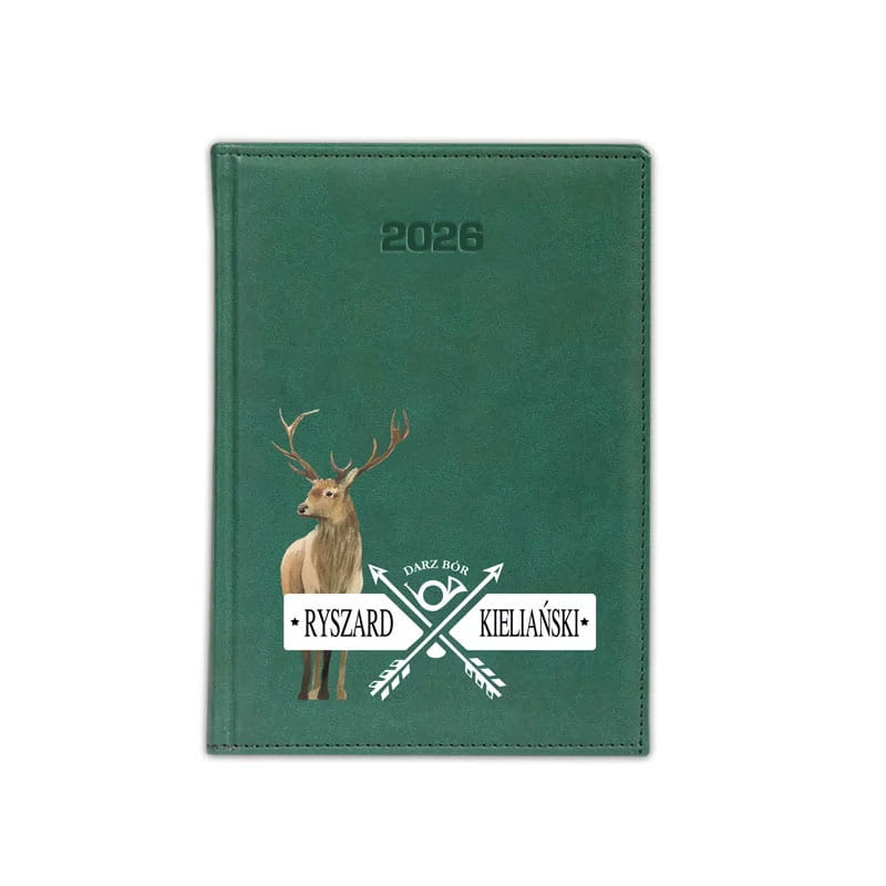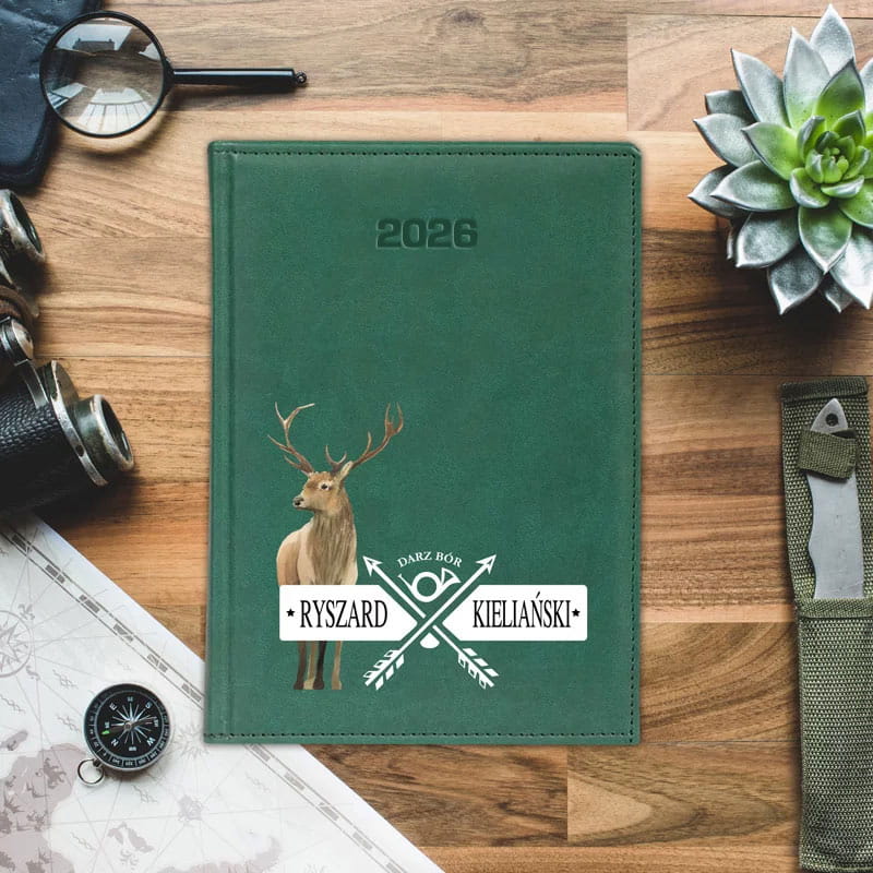 Elegancki kalendarz książkowy 2026 dla myśliwego z motywem jelenia i personalizacją. Idealny prezent z hasłem „Darz Bór” – trwały, praktyczny i stylowy. Zawiera plan dzienny, miejsce na notatki oraz dane.