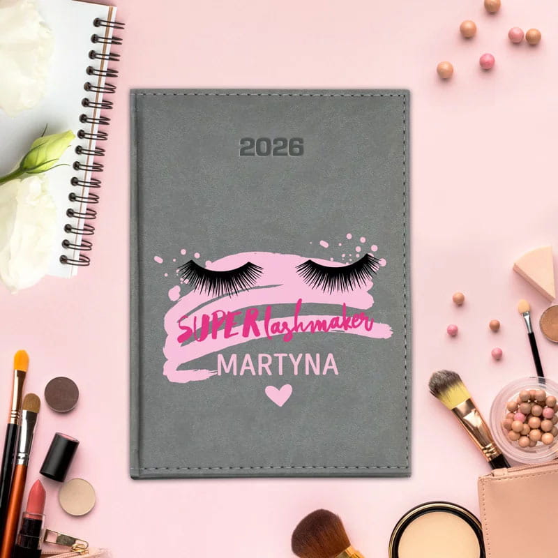 Personalizowany kalendarz 2026 dla stylistki rzęs to stylowy i praktyczny planer. Z napisem „SUPER lashmaker” oraz imieniem tworzy idealny prezent dla kosmetyczki. Pomaga w planowaniu wizyt i codziennych zadań. Elegancki design sprawia, że wyróżnia się w salonie i inspiruje każdego dnia.