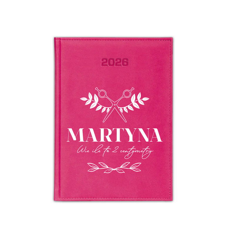 Personalizowana okładka w jednym z 6 dostępnych kolorów od razu przyciąga wzrok, a zabawny napis „(imię właścicielki) – Wie ile to 2 centymetry” na pewno wywoła uśmiech niejednej klientki. Całość dopełnia subtelna grafika nożyczek wplecionych w roślinny motyw, która idealnie podkreśla charakter i estetykę zawodu fryzjerskiego.