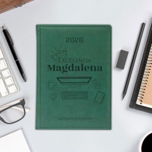 Personalizowana okładka w 6 dostępnych kolorach została ozdobiona zabawnym napisem „EXCELencja Magdalena – najlepsza księgowa” oraz grafikami biurowych symboli, takich jak ekran, klawiatura, kalkulator czy filiżanka kawy