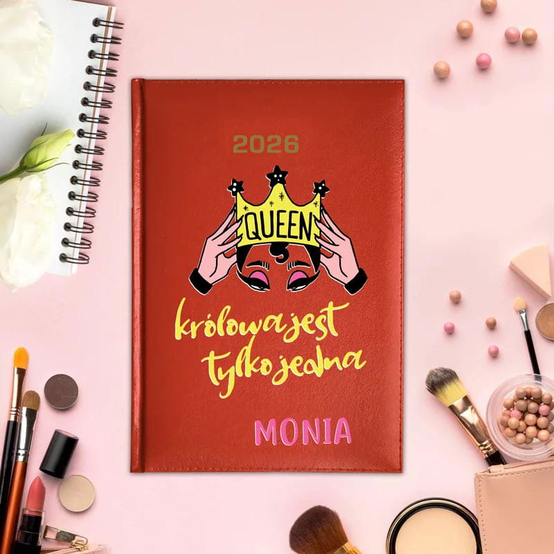 Wyrazisty kalendarz książkowy 2026 z hasłem „Królowa jest tylko jedna” i imieniem to idealny prezent dla kobiety. Efektowna okładka i praktyczne wnętrze tworzą stylowy planer na każdy dzień. Doskonały upominek dla królowej życia – na urodziny, święta lub bez okazji.