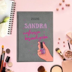 Personalizowana okładka z imieniem właścicielki oraz napisem „najlepsza kosmetyczka” od razu przyciąga wzrok, a ilustracja kobiecej dłoni trzymającej lakier do paznokci doskonale oddaje charakter i styl branży beauty.