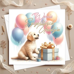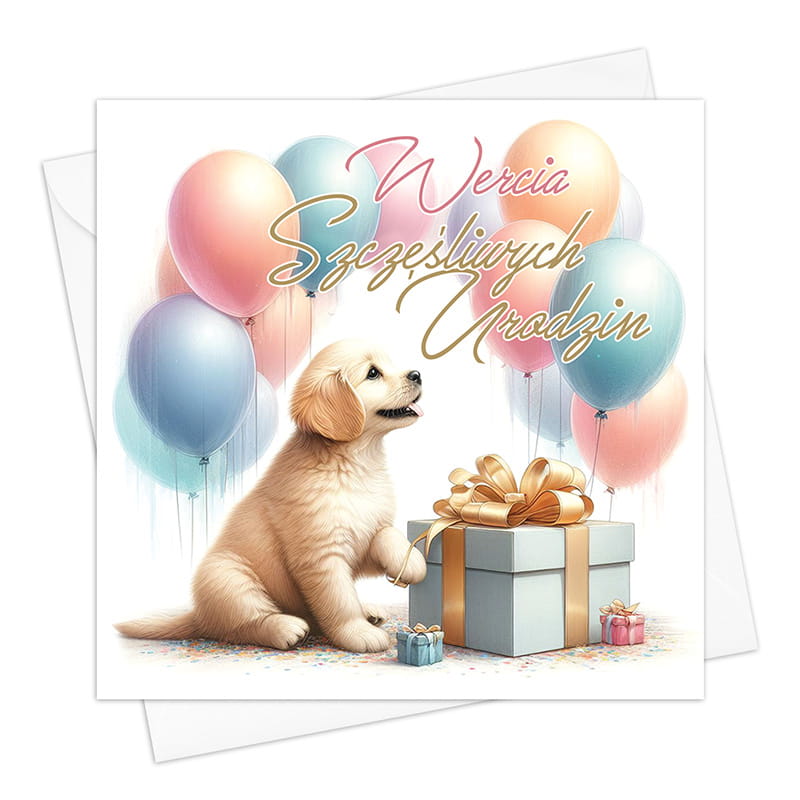 Po otwarciu kartki motyw graficzny jest kontynuowany — piesek siedzi wśród prezentów i balonów, obok widnieje ozdobny napis „Sto lat”. Po prawej stronie umieszczono pełne optymizmu i ciepła życzenia: