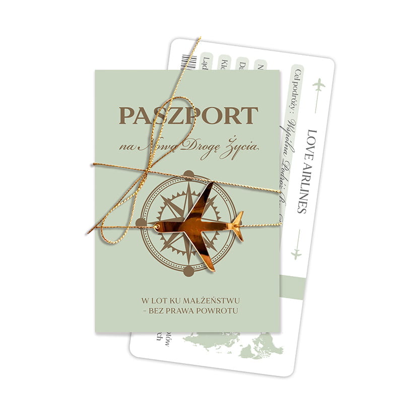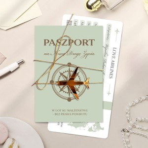 Oryginalna kartka ślubna w formie paszportu to nietypowa propozycja dla par, które cenią podróżnicze klimaty i lubią oryginalne akcenty. Utrzymana w pastelowej zieleni, ozdobiona napisem „PASZPORT na Nową Drogę Życia” i motywem kompasu na okładce, przyciąga uwagę swoim designem. Całość przewiązana jest złotym sznurkiem z zawieszką w kształcie samolotu, która dodaje całości elegancji i unikalności.