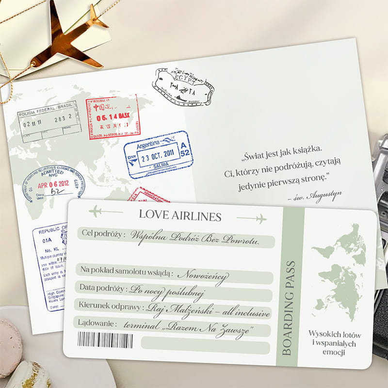 To nie jest zwykła kartka ślubna, lecz pomysłowa propozycja w formie paszportu z biletem, która w podróżniczym stylu symbolicznie prowadzi nowożeńców w „lot ku małżeństwu”.
