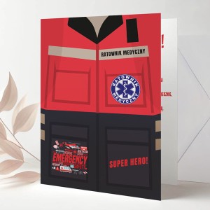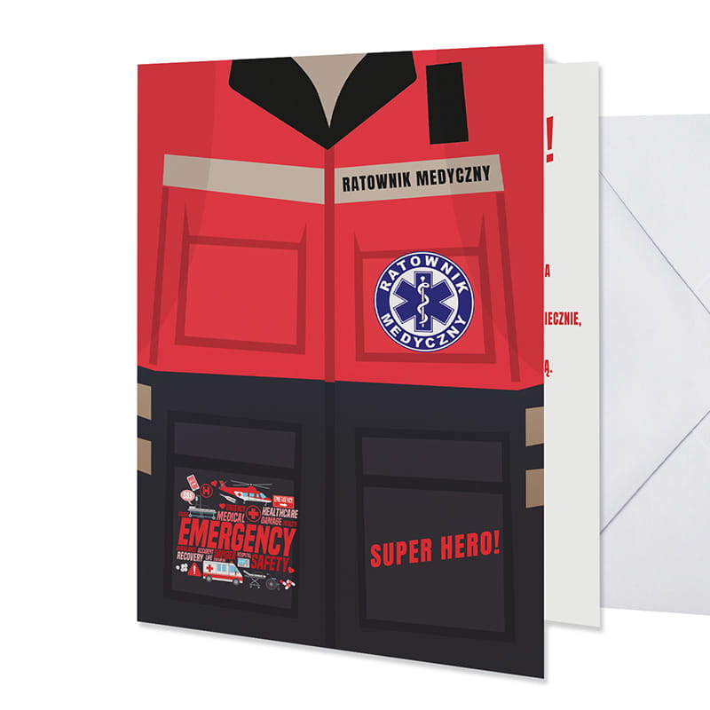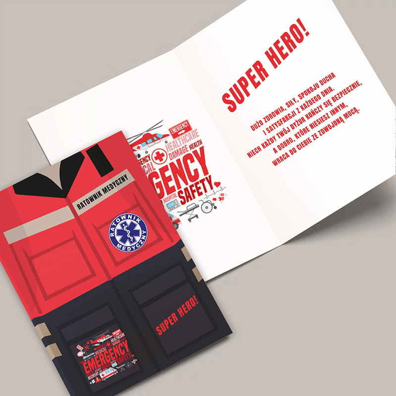 Kartka dla ratownika medycznego z motywem uniformu i napisem „SUPER HERO!”. Idealna na każdą okazję – urodziny, awans, jubileusz czy Dzień Ratownika. Uniwersalna i emocjonalna, z miejscem na własne życzenia. Świetny sposób na wyrażenie uznania i wdzięczności.