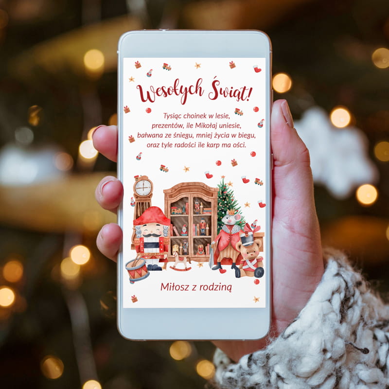 Kartka elektroniczna na Boże Narodzenie z rymowanymi życzeniami i możliwością personalizacji. Wyślij bliskim świąteczne pozdrowienia w kilka sekund – szybko, elegancko i ekologicznie.