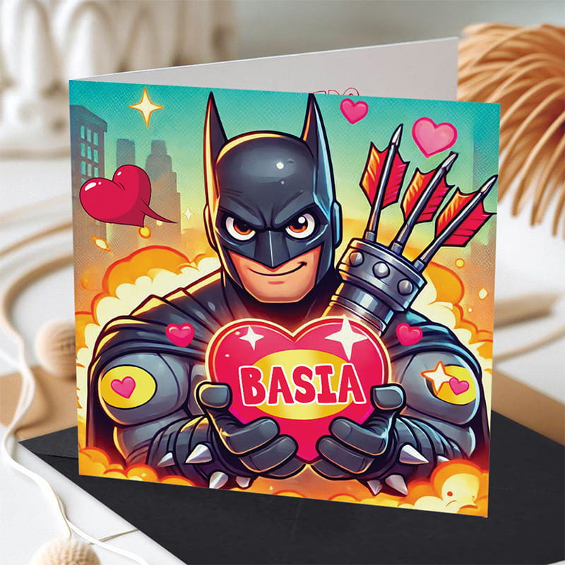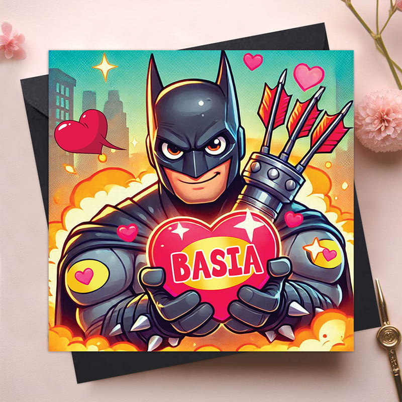 Personalizowana kartka walentynkowa z motywem Batmana to świetny sposób na to, aby powiedzieć „kocham” w oryginalny sposób. Na froncie kartki widnieje ilustracja w komiksowym stylu, przedstawiająca postać inspirowaną Batmanem. Bohater w charakterystycznej masce trzyma w dłoniach wielkie serce z umieszczonym w centrum imieniem ukochanej, które personalizujesz. Całość otaczają unoszące się serca, strzały miłości oraz tło w intensywnych, nasyconych barwach. Dzięki personalizacji kartka nabiera wyjątkowo, osobistego wymiaru.