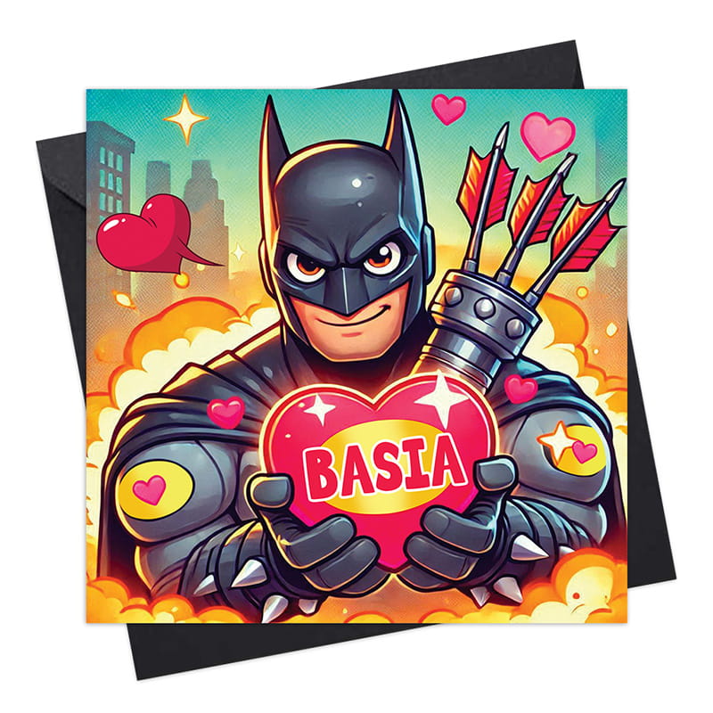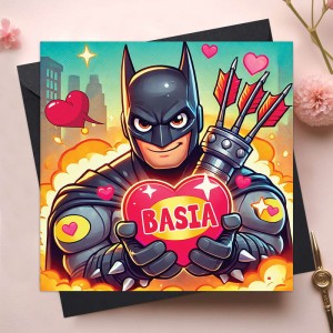 Kartka walentynkowa z motywem Batmana, personalizacją i gotowymi życzeniami w środku.