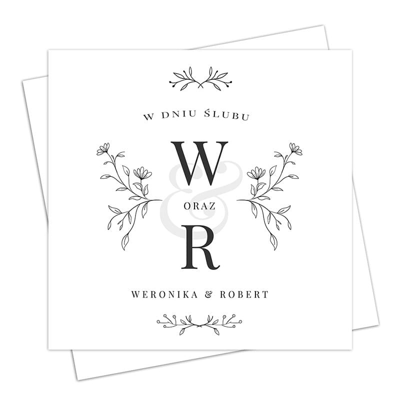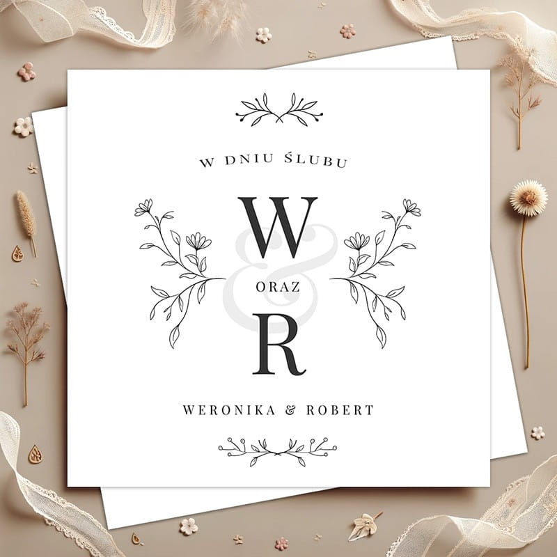 Minimalistyczna, personalizowana kartka na ślub z inicjałami Pary Młodej. Elegancka pamiątka, która podkreśli wyjątkowość tego dnia.