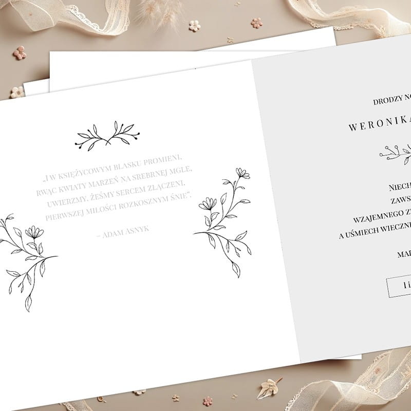 Elegancka i subtelna, personalizowana kartka ślubna o minimalistycznym designie to idealny wybór dla tych, którzy cenią sobie prostotę. Delikatne inicjały pary młodej oraz subtelne elementy florystyczne tworzą harmonijną całość na czystym, białym tle. W środku kartki znajdują się starannie dobrane życzenia oraz miejsce na podpis i datę, co nadaje jej wyjątkowego charakteru.