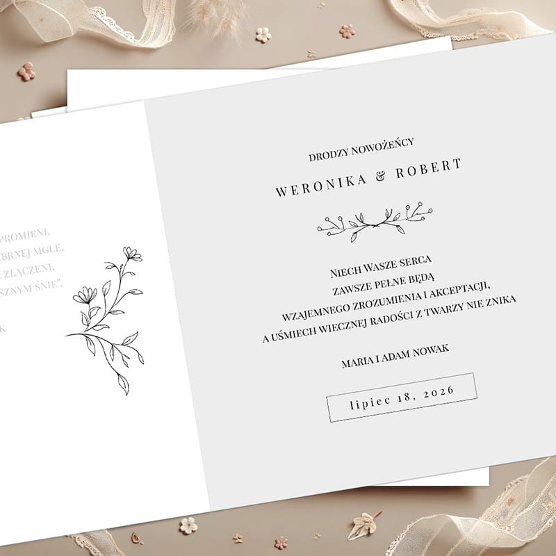Minimalistyczna kartka ślubna doskonale sprawdzi się jako dodatek do prezentu, wyrażając serdeczne życzenia w pięknej formie. Idealna na każdą uroczystość ślubną, zarówno w stylu klasycznym, jak i nowoczesnym. Dzięki personalizacji stanie się wyjątkową pamiątką tego szczególnego dnia.