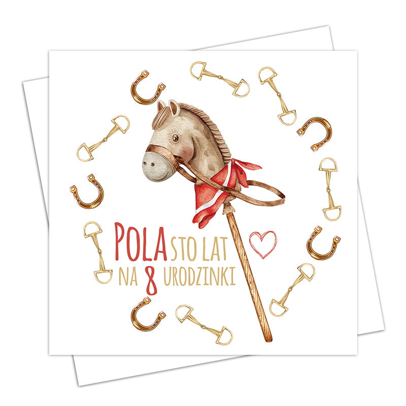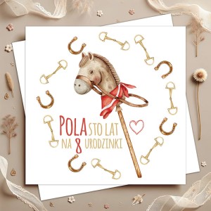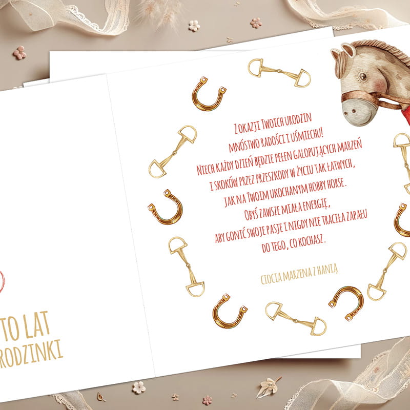 Spersonalizowana kartka urodzinowa dla dziewczynki z motywem Hobby Horse. Idealny dodatek do prezentu, który zachwyci każdą małą fankę koni i umili jej wyjątkowy dzień.