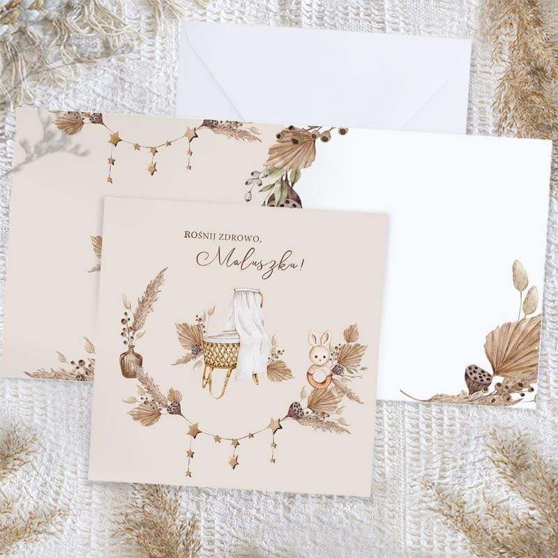 Kartka z kolekcji Boho urzeka subtelnym połączeniem naturalnych akcentów i harmonijnych kolorów. Obok znalazła się urocza ilustracja pluszowego króliczka i wiklinowej kołyski. Całość dopełnia napis „Rośnij zdrowo, Maluszku!”, który idealnie oddaje serdeczne życzenia dla nowego członka rodziny.
