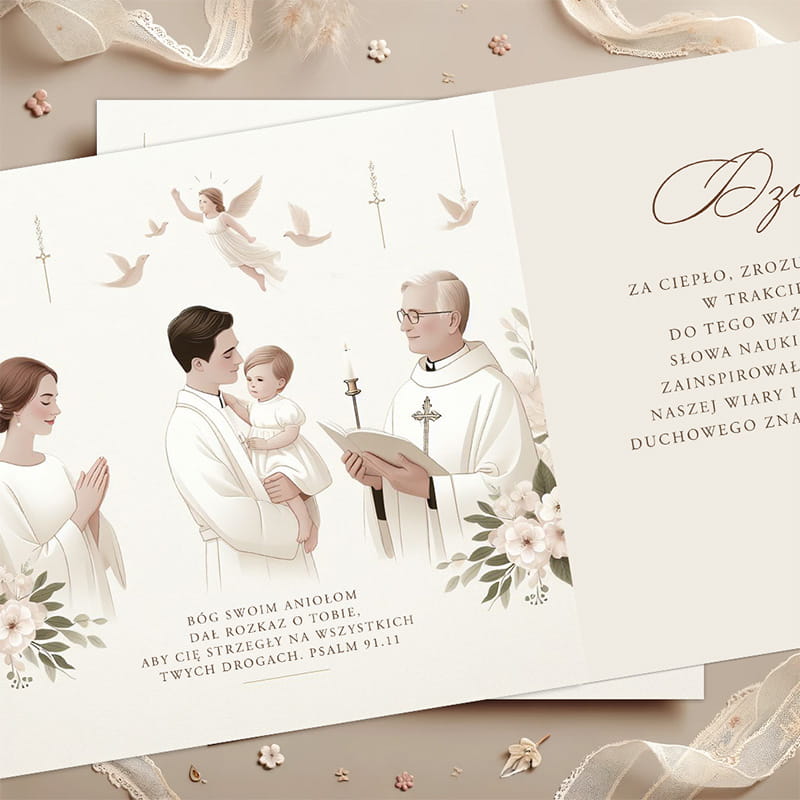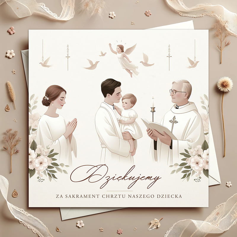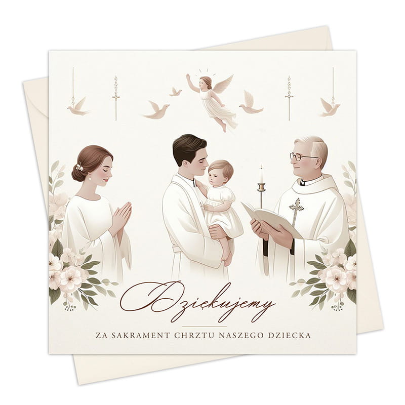 Na zewnątrz kartki widnieje grafika przedstawiająca rodzinę i Księdza w trakcie ceremonii Chrztu. Aniołek, gołębie i kwiatowe motywy dodają kartce sakralnego charakteru. Ilustracje wykonane zostały w subtelnych, pastelowych kolorach. Front eleganckiej kartki zdobią słowa "Dziękujemy za Sakrament Chrztu naszego dziecka". Wewnątrz kartki znajduje się miejsce na osobiste podziękowania: