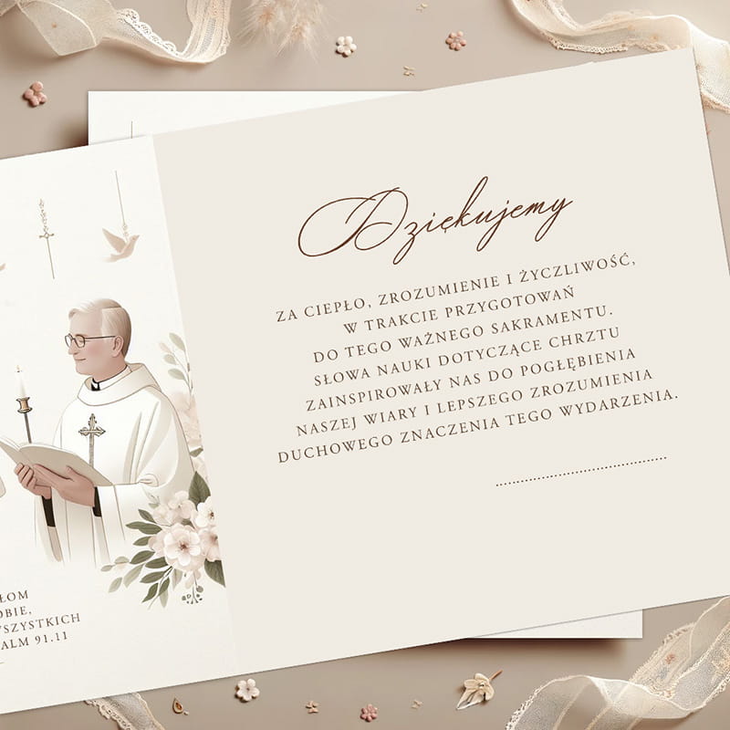Kartka ta to sposób na wyrażenie wdzięczności Księdzu za jego duchowe wsparcie i nauki. Jest to również piękna pamiątka dla Księdza, świadcząca o zaangażowaniu rodziców i ich dziecka w życie Kościoła. To symbol więzi między rodziną a ich duszpasterzem, podkreślający istotę Chrztu Świętego i radość, jaką niesie ze sobą ta sakramentalna chwila.