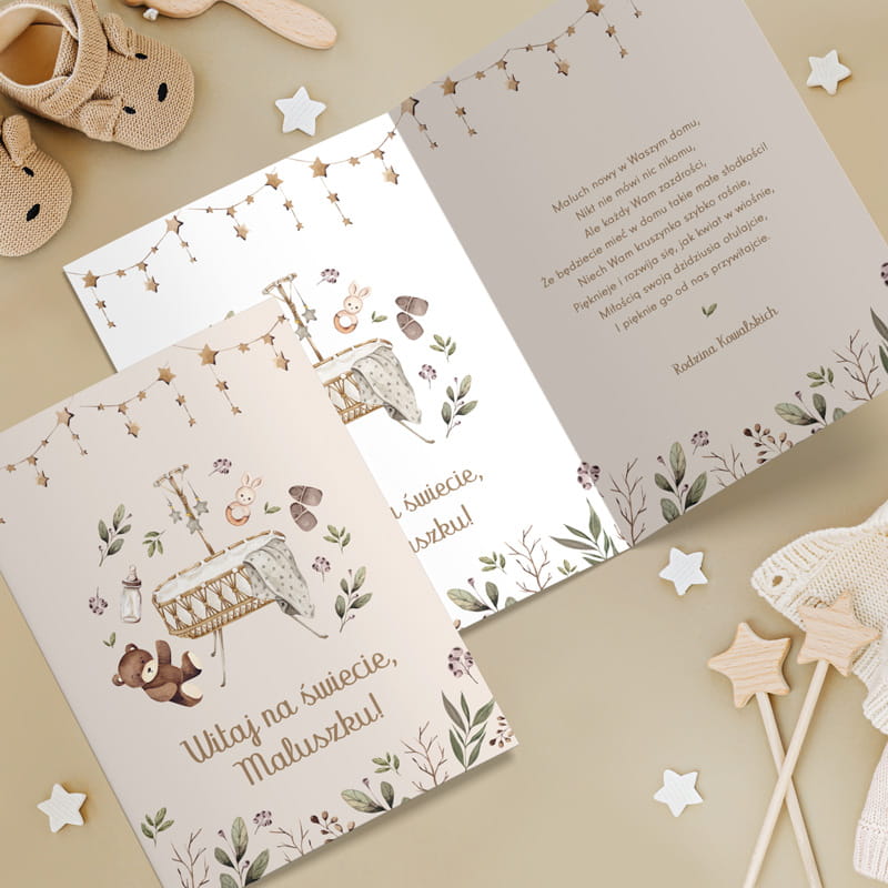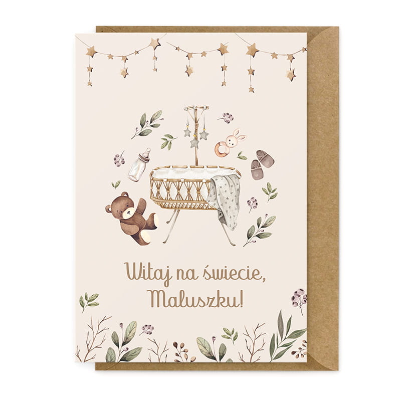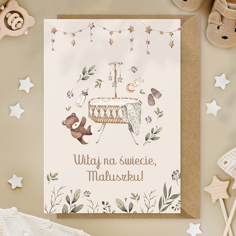 Na kartce widnieje akwarelowa ilustracja wiklinowego kosza–kołyski z kocykiem, otoczonego dziecięcymi akcesoriami, takimi jak pluszowy miś, butelka do karmienia, króliczek–zabawka, gryzak i maleńkie buciki.