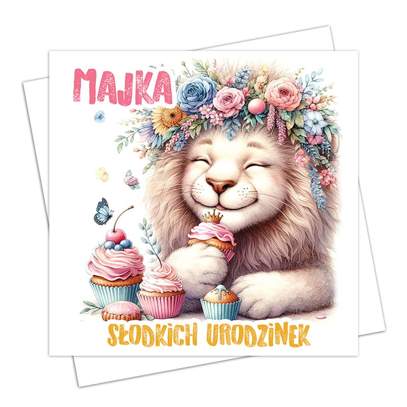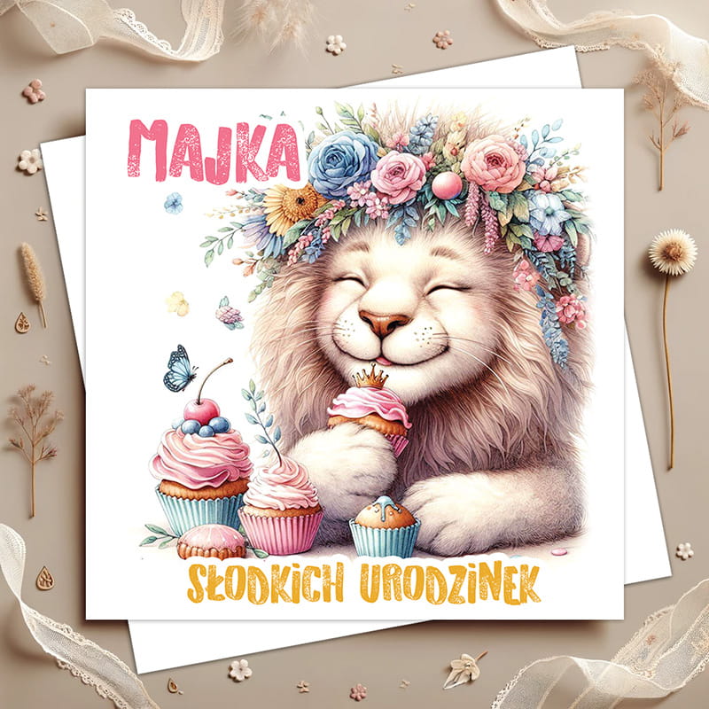 Na okładce kartki widnieje lew z szerokim uśmiechem, który nadaje całej ilustracji pogodny charakter. Jego grzywę zdobi wianek z kwiatów w odcieniach różu, błękitu i zieleni. Obok unoszą się motylki, dodające kompozycji lekkości i bajkowego uroku. W dolnej części ilustracji znajdują się babeczki z kolorowymi kremami i dekoracjami. Na górze widnieje imię solenizanta zapisane w dużych, różowych literach, a na dole umieszczono radosny napis „Słodkich Urodzinek”.
