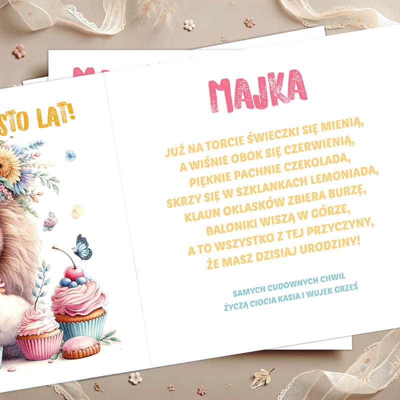 Po otwarciu kartki, na lewej stronie kontynuowany jest motyw uśmiechniętego lwa i słodkich wypieków, co tworzy spójny, harmonijny efekt wizualny. Prawa strona mieści pełen barw, wesoły wierszyk: