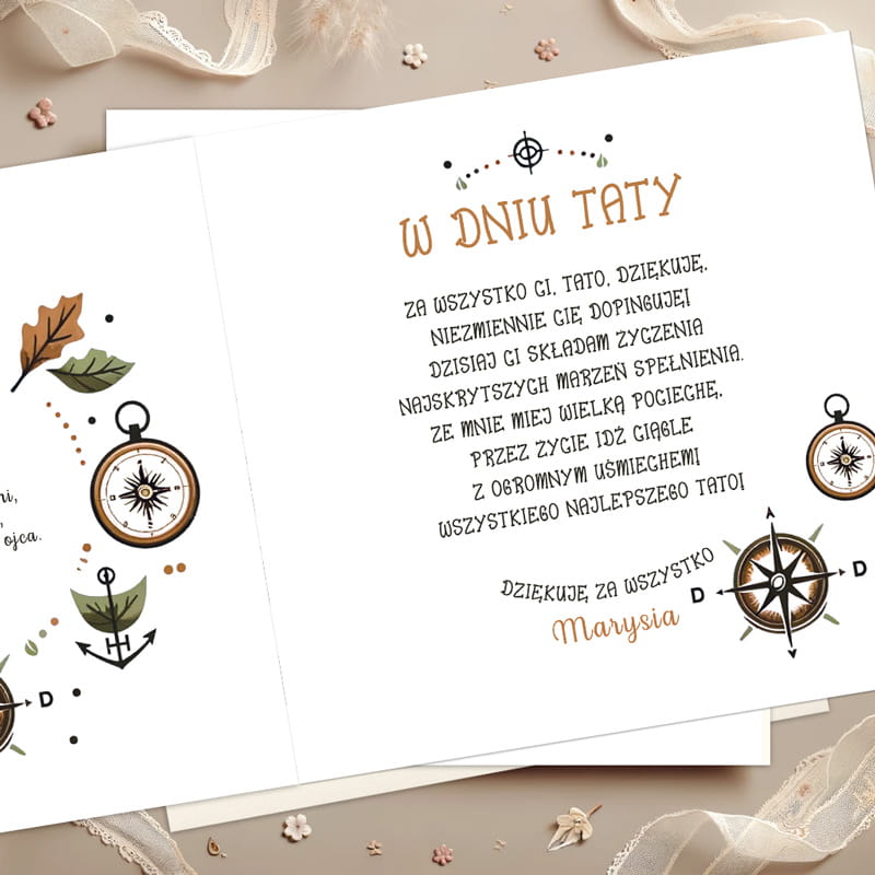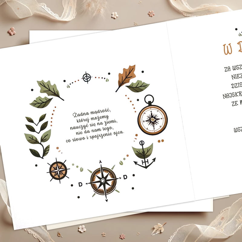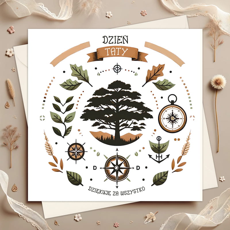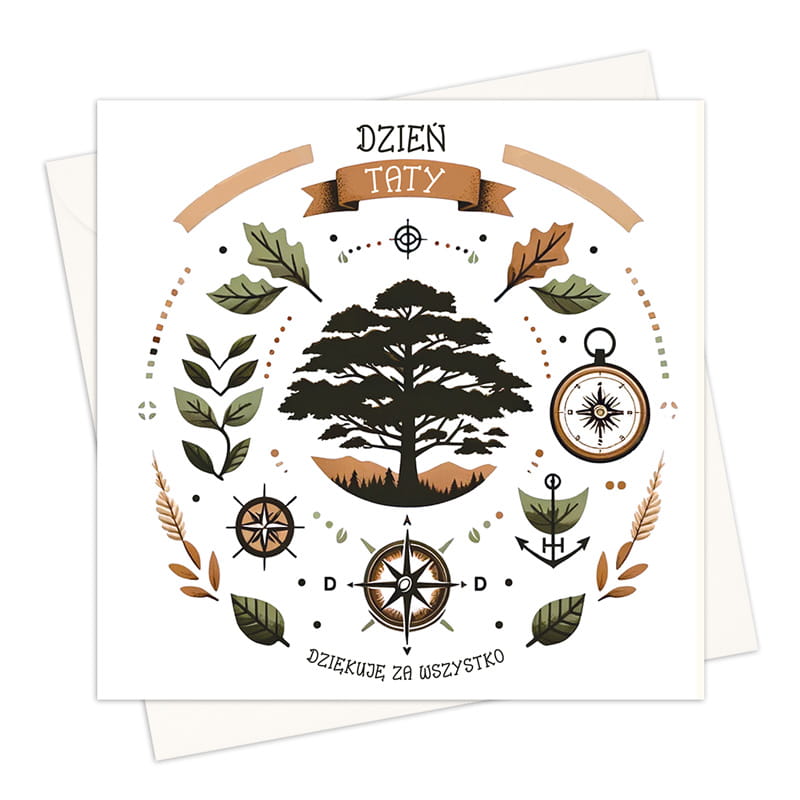 Personalizowana kartka na Dzień Taty z grafiką drzewa, kompasów i liści w odcieniach brązu i zieleni. Napis „Dziękuję za wszystko” podkreśla emocjonalny przekaz. Zapakowana w białą kopertę i folię ochronną, stanowi wzruszający prezent oraz pamiątkę, która na długo pozostanie w sercu taty.
