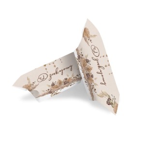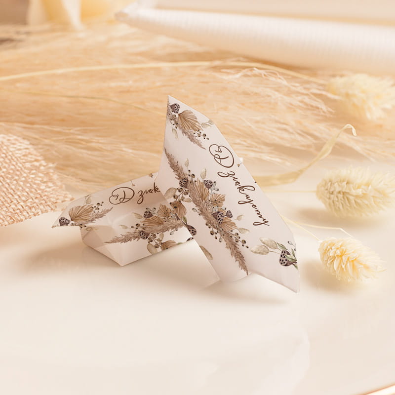 Krówka uniwersalna w stylu boho, to drobne, ale pyszne podziękowanie dla twoich gości. Krówki zdobione grafiką przedstawiającą suszone rośliny i kwiaty w odcieniach beżu, wyglądają bardzo neutralnie i doskonale wpisują się w klimat wielu przyjąć. Na środku etykiety znajduje się napis „Dziękujemy”. Krówki można wykorzystać jako podziękowanie dla gości na ślub, rocznicę ślubu, ale także na Chrzest czy Komunię jako wyraz wdzięczności od rodziców i dziecka.