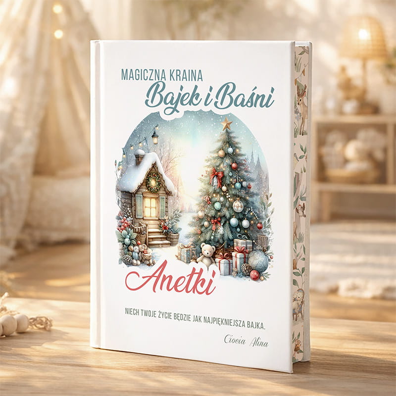 Na okładce w centralnym miejscu znajduje się imię dziecka, a całość uzupełnia dedykacja od osoby wręczającej podarunek. Ilustracja przedstawia zimową scenerię – ośnieżony domek z rozświetlonymi oknami, pięknie udekorowaną choinkę, kolorowe prezenty i pluszowego misia. Pastelowe barwy, świąteczne detale i napis „Niech Twoje życie będzie jak najpiękniejsza bajka” nadają książce bajkowego charakteru i sprawiają, że staje się wyjątkową pamiątką Bożego Narodzenia. Wewnątrz znalazł się zbiór bajek i baśni napisanych prostym, przystępnym językiem, idealnym dla najmłodszych. Każda opowieść niesie wartościowy morał, rozwija wyobraźnię i uczy poprzez zabawę, a towarzyszące ilustracje w delikatnej, baśniowej stylistyce dodatkowo zachęcają do wspólnego czytania. To doskonała propozycja na wieczorne chwile z dzieckiem, które sprzyjają wyciszeniu i budowaniu rodzinnych więzi.
