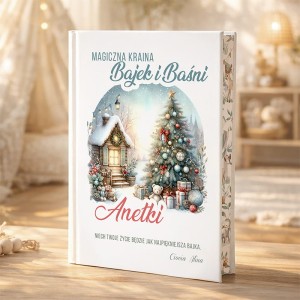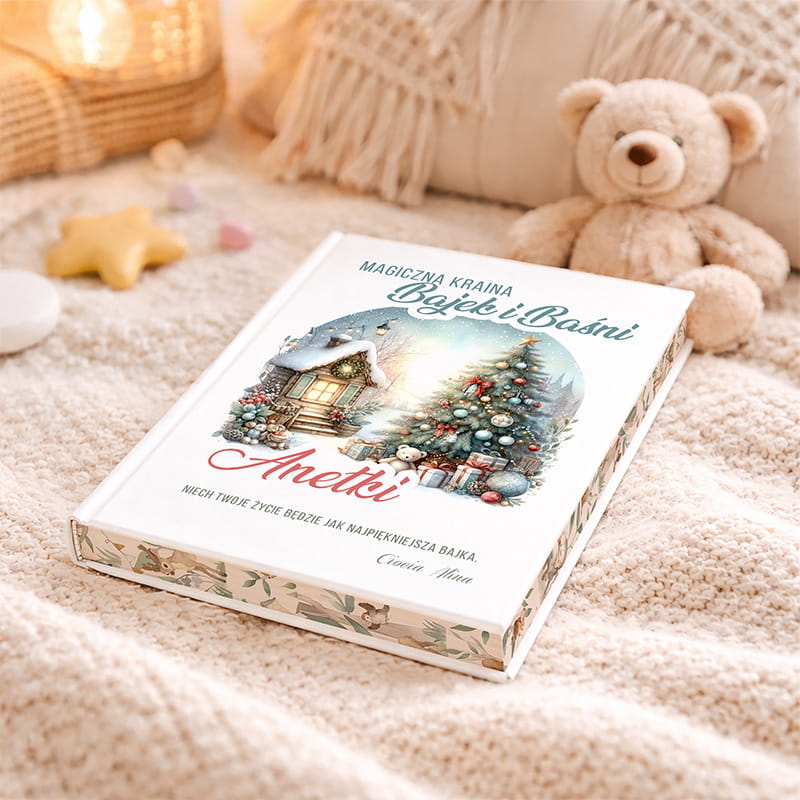 Personalizowana książka z bajkami „Magiczna kraina bajek i baśni” z imieniem dziecka i świąteczną grafiką na okładce.
